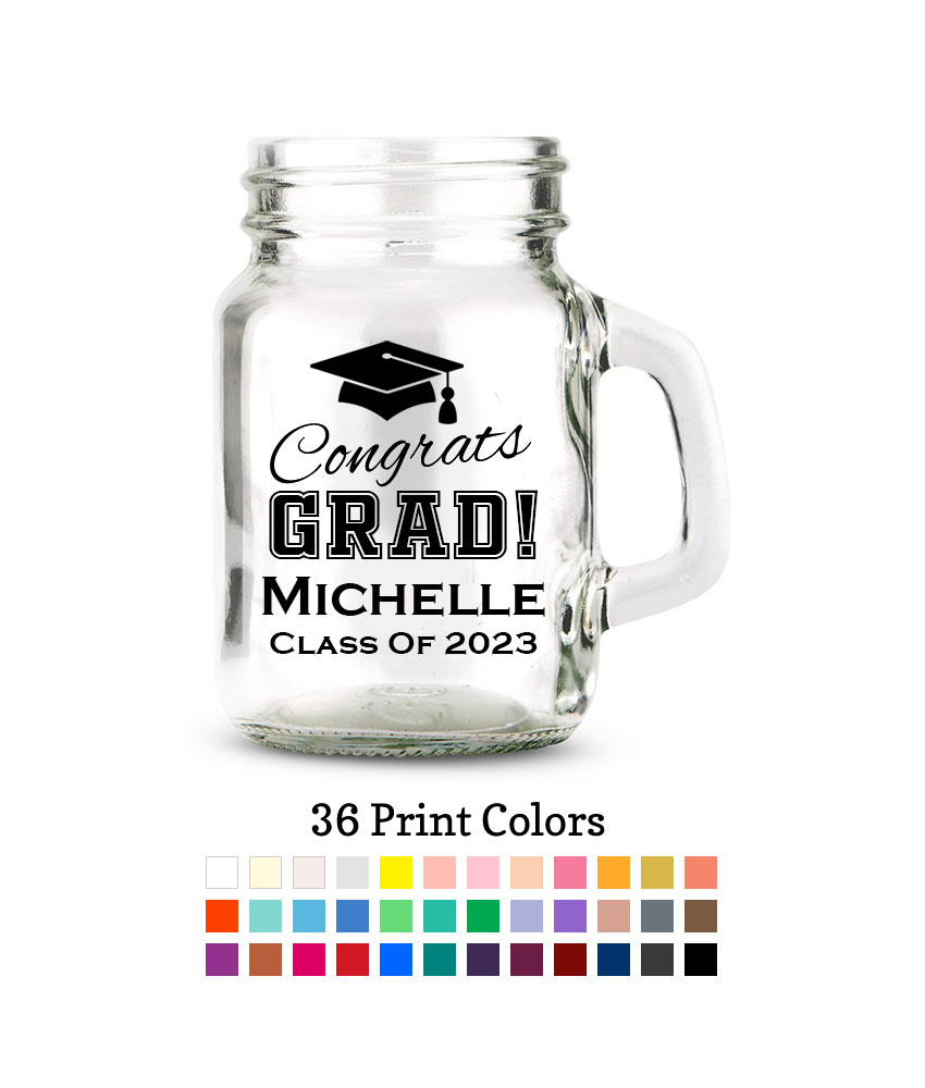 Toast your special event with our quality Congrats Grad 4 oz. Personalized Mason Jar Shot Glasses! Your guests will be thrilled to take one home as a keepsake.