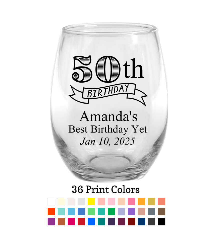 50 Birthday Banner custom wine glass. Make drinking fun and pretty with these Personalized 9 oz Stemless Wine Glasses.