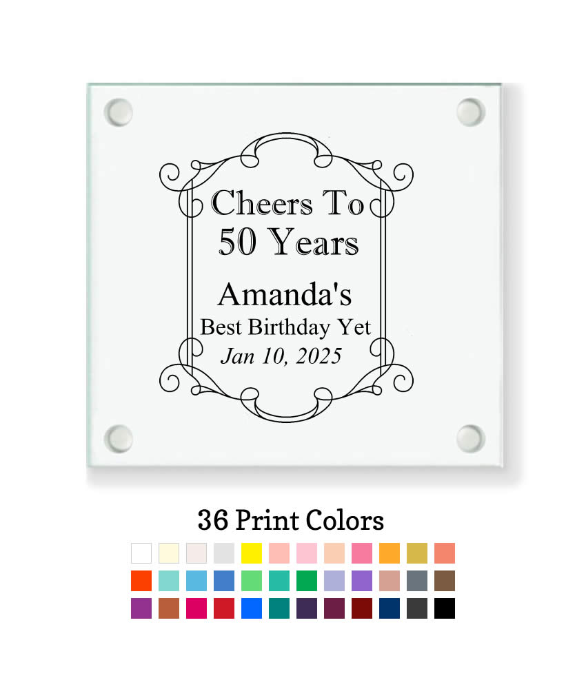 Cheers to 50 Years Scroll Custom Glass Coasters – FREE Rush