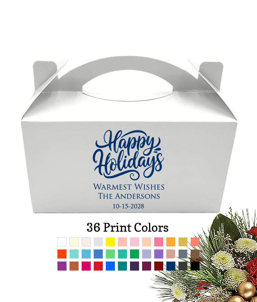 Send your guest home with our large white Gable Gift Boxes filled with your goodies or party favors – Happy Holidays Design! Your guests will be thrilled to take one home as a keepsake.