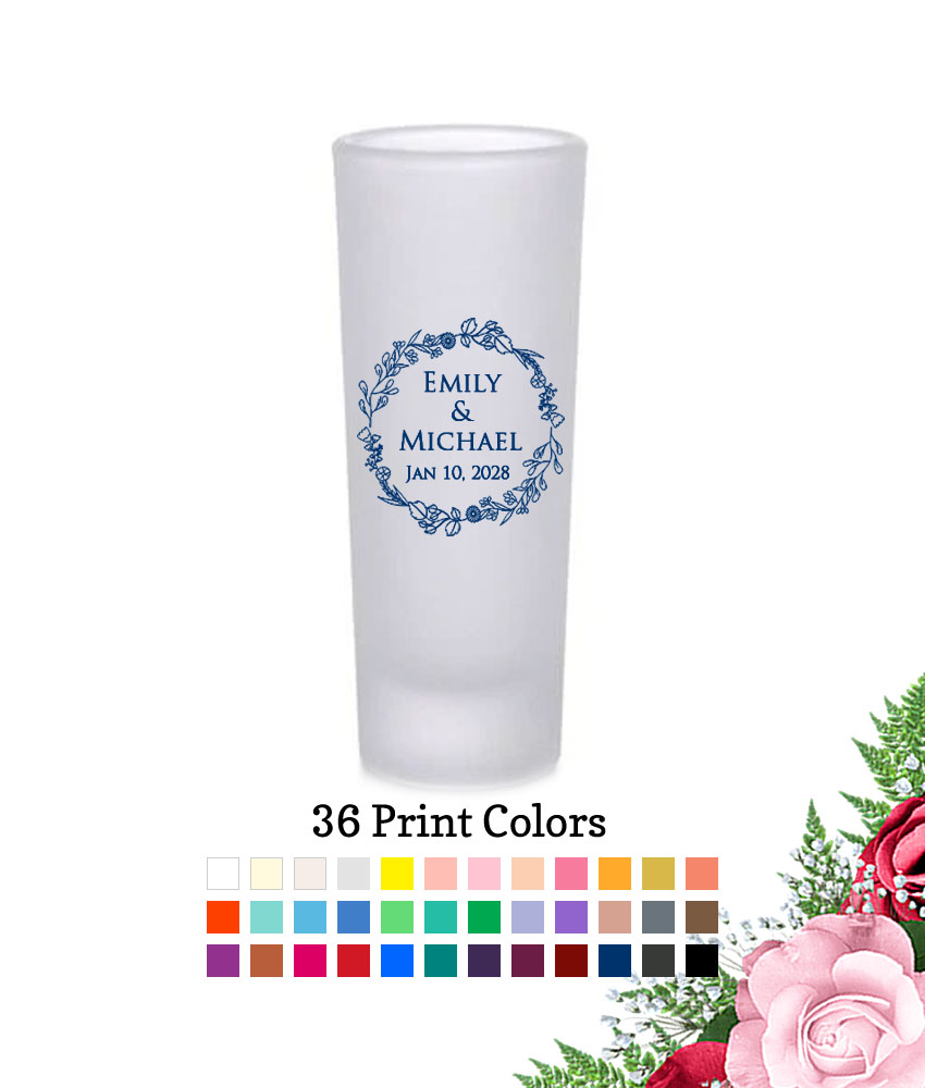 Create your own favor with these Custom 2 oz. Frosted Tall Shot Glass Shooter Glass Wedding Souvenirs Floral Wreath. There’s nothing quite like personalized favors with a touch of personality!