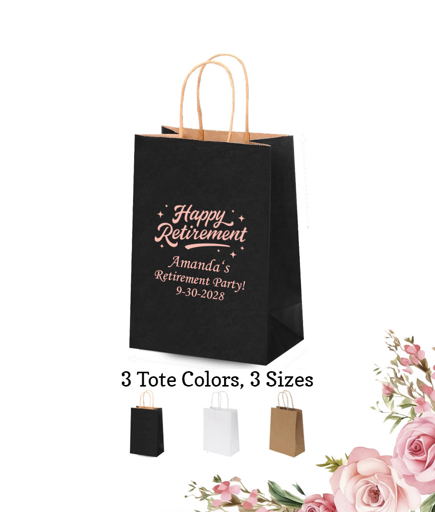 Send your guests home with our personalized paper tote gift bags with handles filled with goodies they can enjoy later – Happy Retirement!