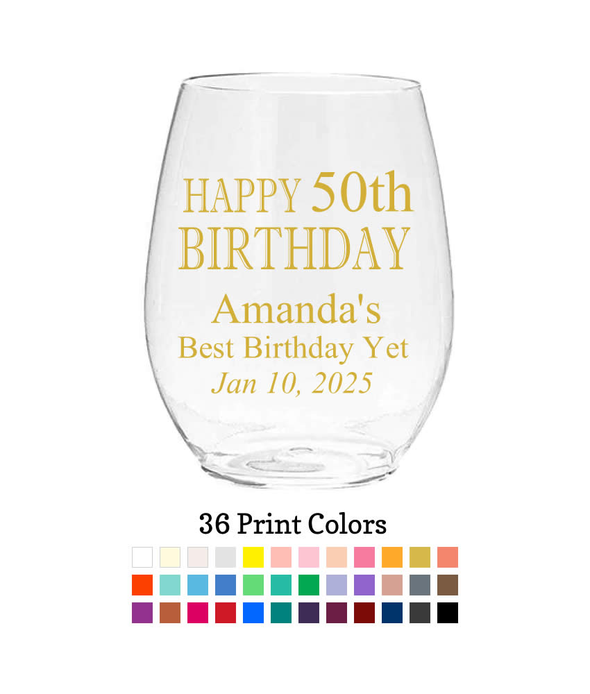 Make drinking fun and pretty with these Happy 50th Birthday Plastic Custom Stemless Wine Glass