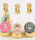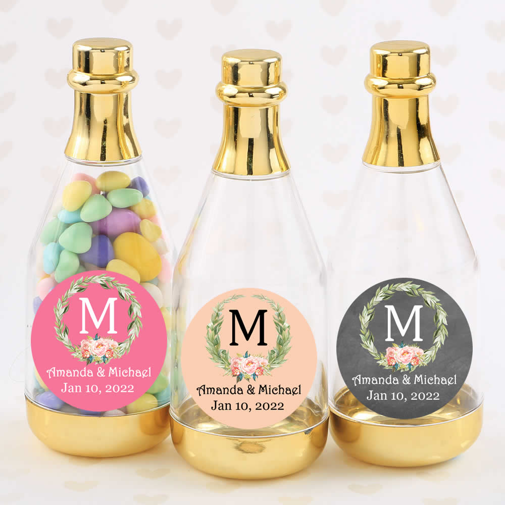 Laurel Floral Monogram Gold Champagne Bottle Container. These cute little acrylic Champagne bottles will add excitement to your celebration. Get creative and fill them with special treats or small sentimental gifts of your choice for each guest.