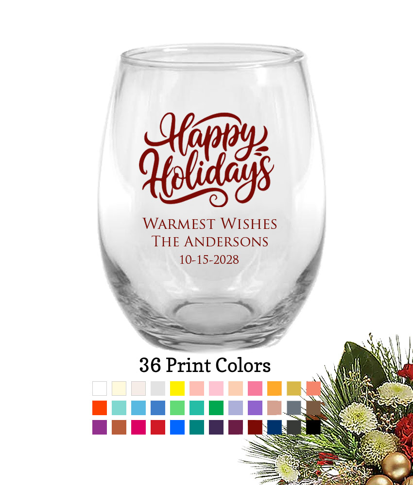 Make drinking fun and pretty with these Happy Holiday Personalized 9 oz Stemless Wine Glasses.