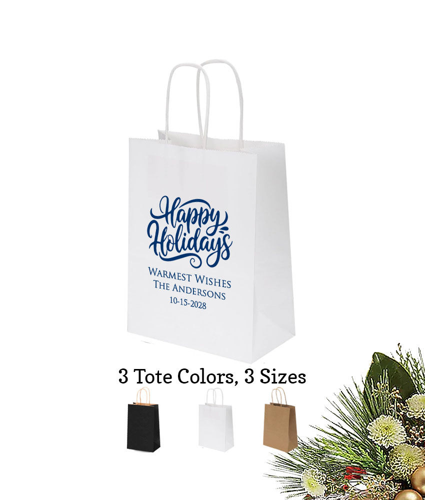 Send your guests home with our personalized paper tote gift bags with handles filled with goodies they can enjoy later – Happy Holidays Design!