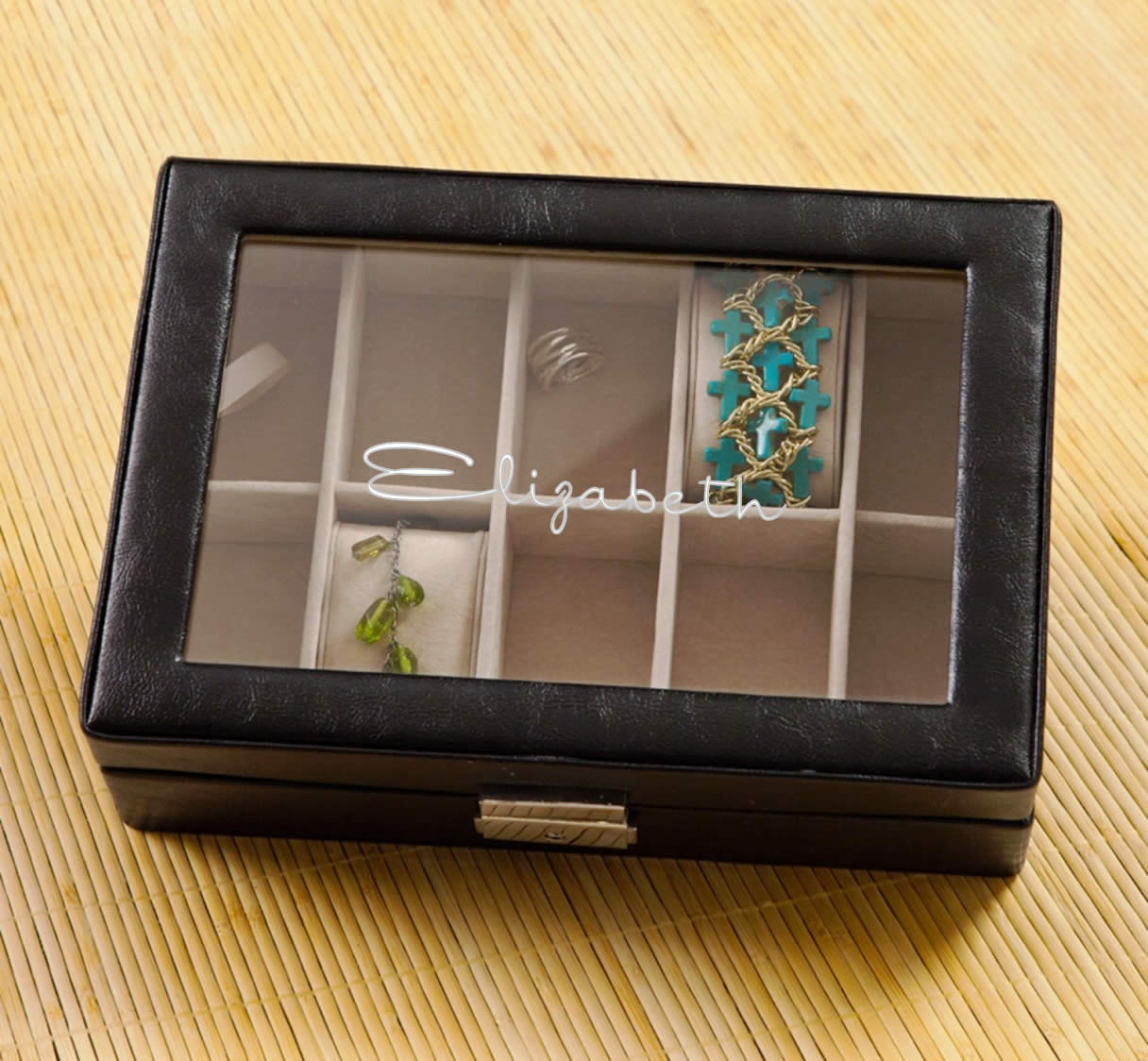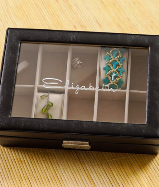 - Polished-nickel clasp & lock (key provided) Engraved Glass lid