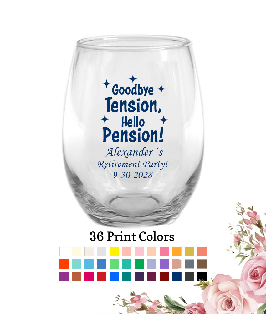 Make drinking fun and pretty with these Personalized Retirement Party Favors Stemless Glasses 9 oz. GoodBye Tension Hello Pension