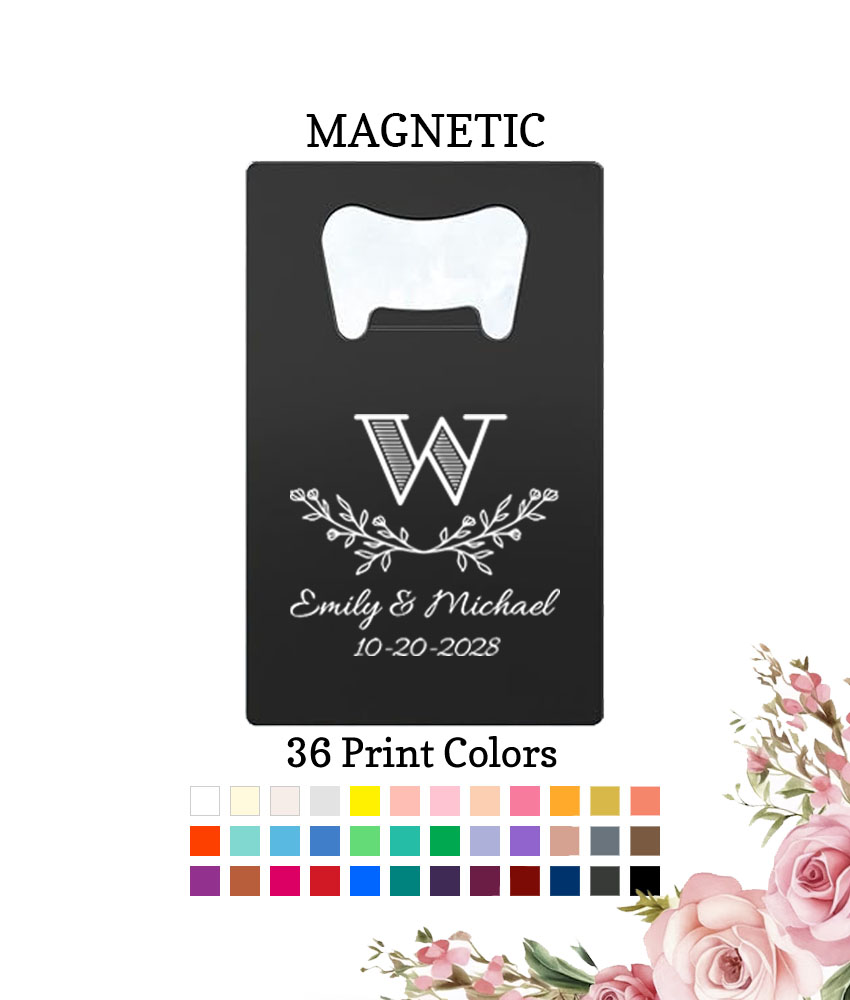 Get your guests popping those caps with these Personalized Wedding Black Magnetic Credit Card Bottle Openers Leaf Monogram. This fun and practical gift is always associated with good times.