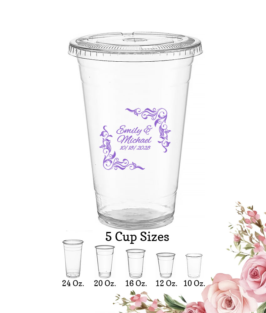 Serve your guests with your most popular cold beverages with this Personalized Wedding Clear Plastic Cups With FREE Lids – Leaf Scroll Border