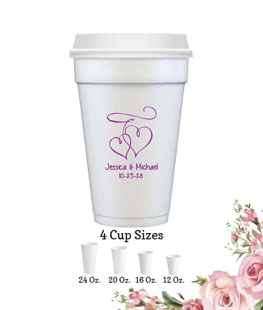 Serve your guests with your most popular hot or cold beverages with this Personalized Styrofoam Cups With FREE Lids – Interlocking Hearts.