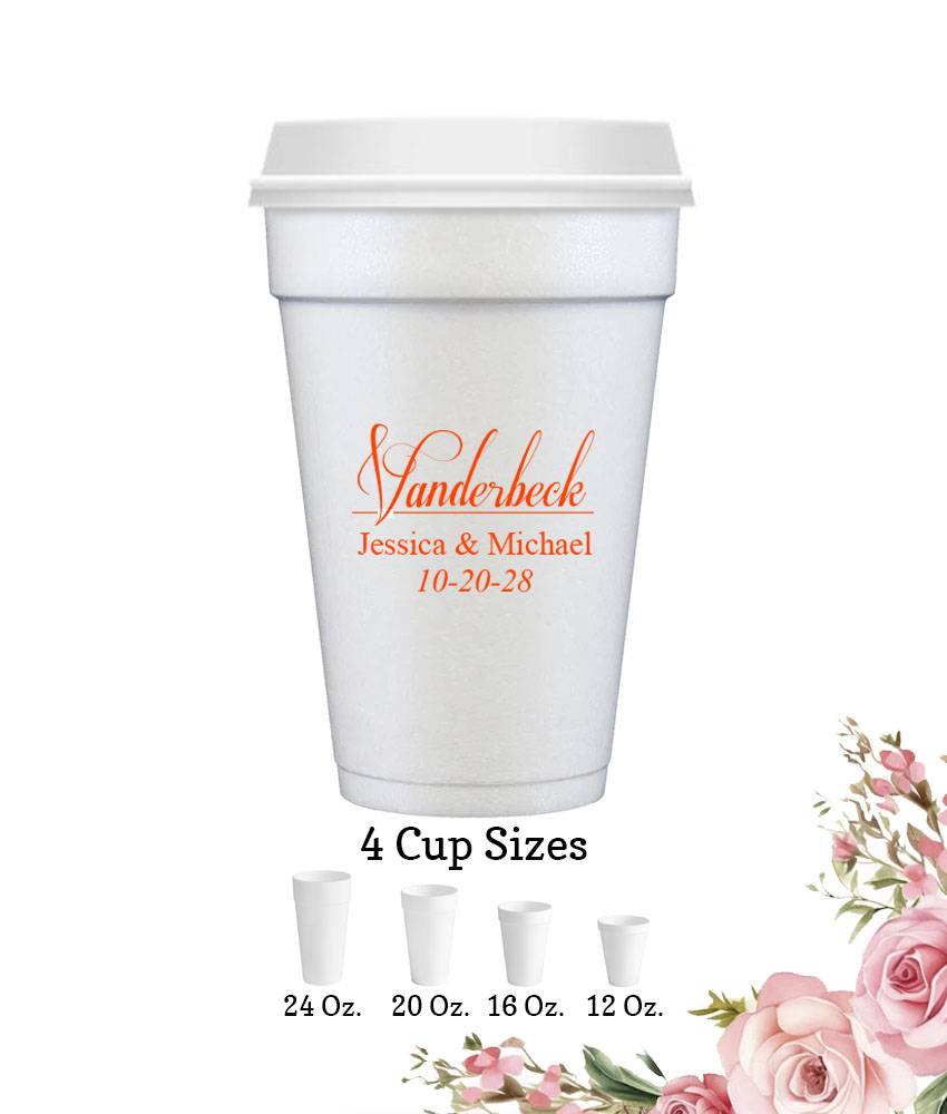 Serve your guests with your most popular hot or cold beverages with this Personalized Styrofoam Cups With FREE Lids – Last Name Script.