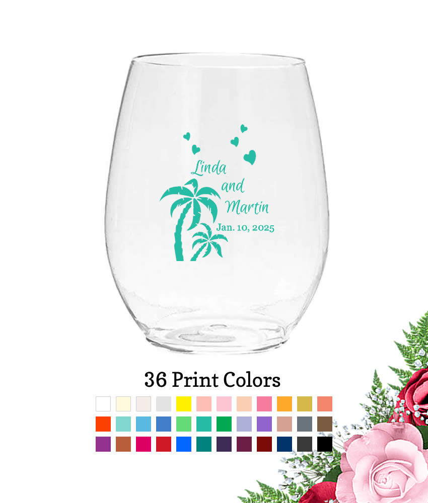 Make drinking fun and pretty with these Personalized 10 oz. Plastic Stemless Wine Glasses – Palm Trees