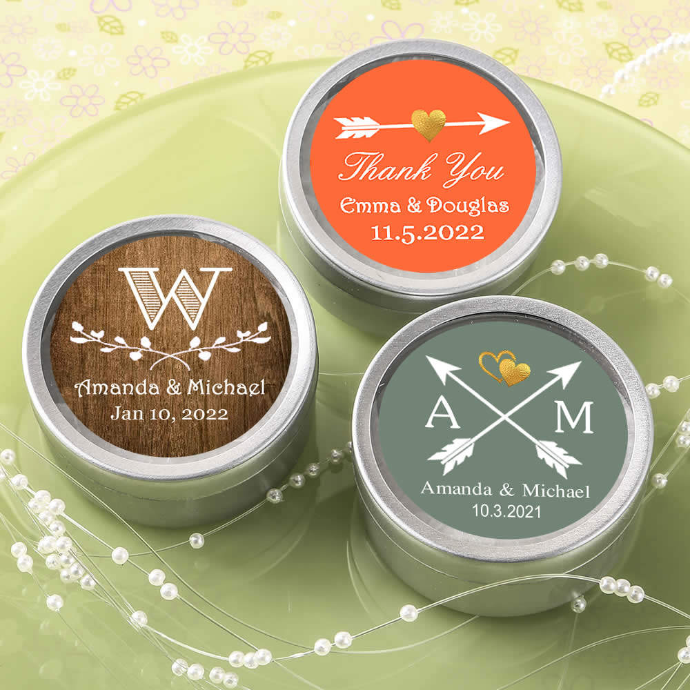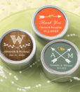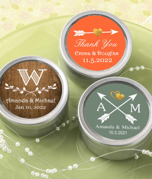 Rustic Designs Personalized travel candles. Sure to please, these scented round travel candles make fragrant favors with flair. Looking for useful and cheery favors that add a little something special to your guests’ day? Well, these scented travel candles are literally like a breath of fresh air!